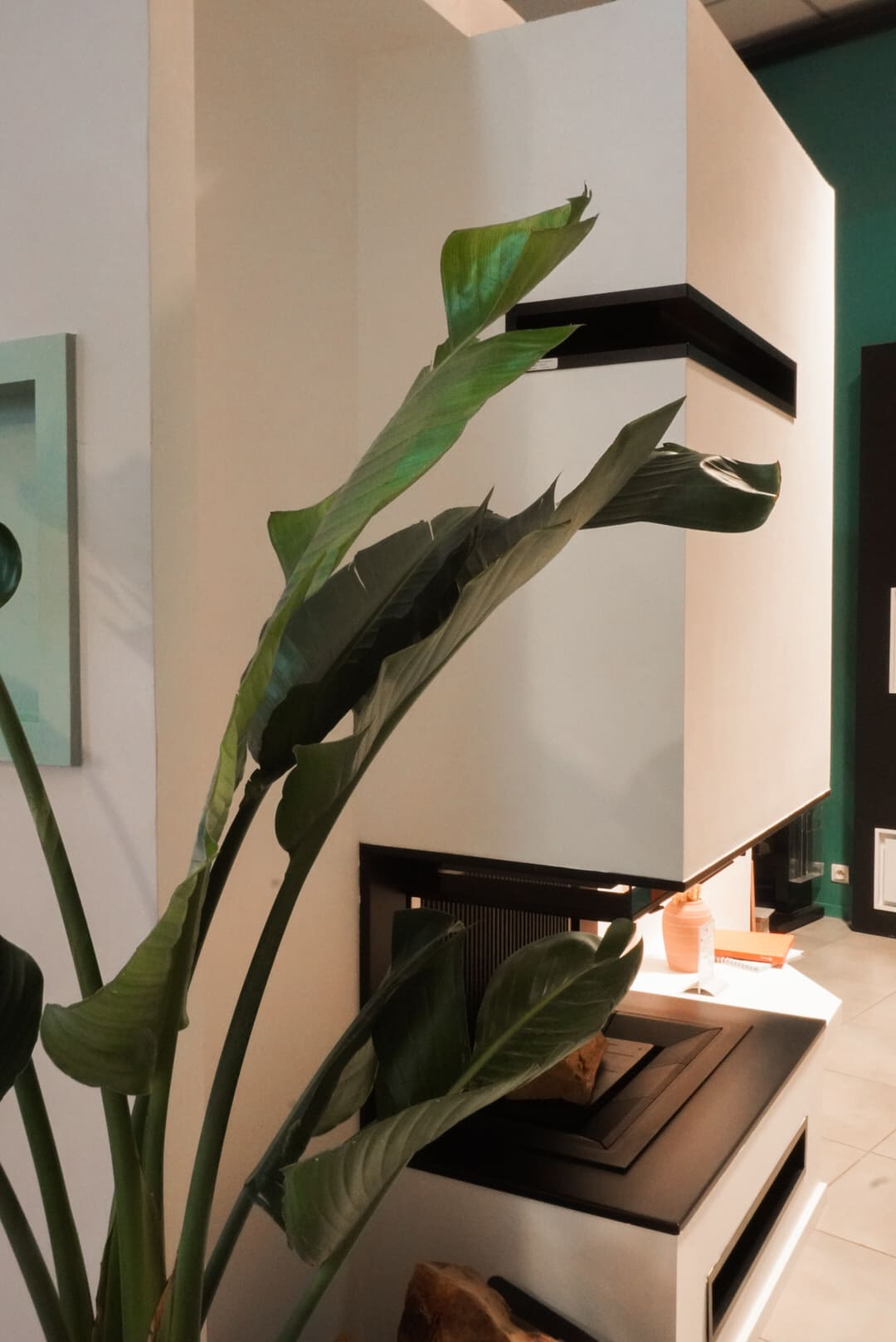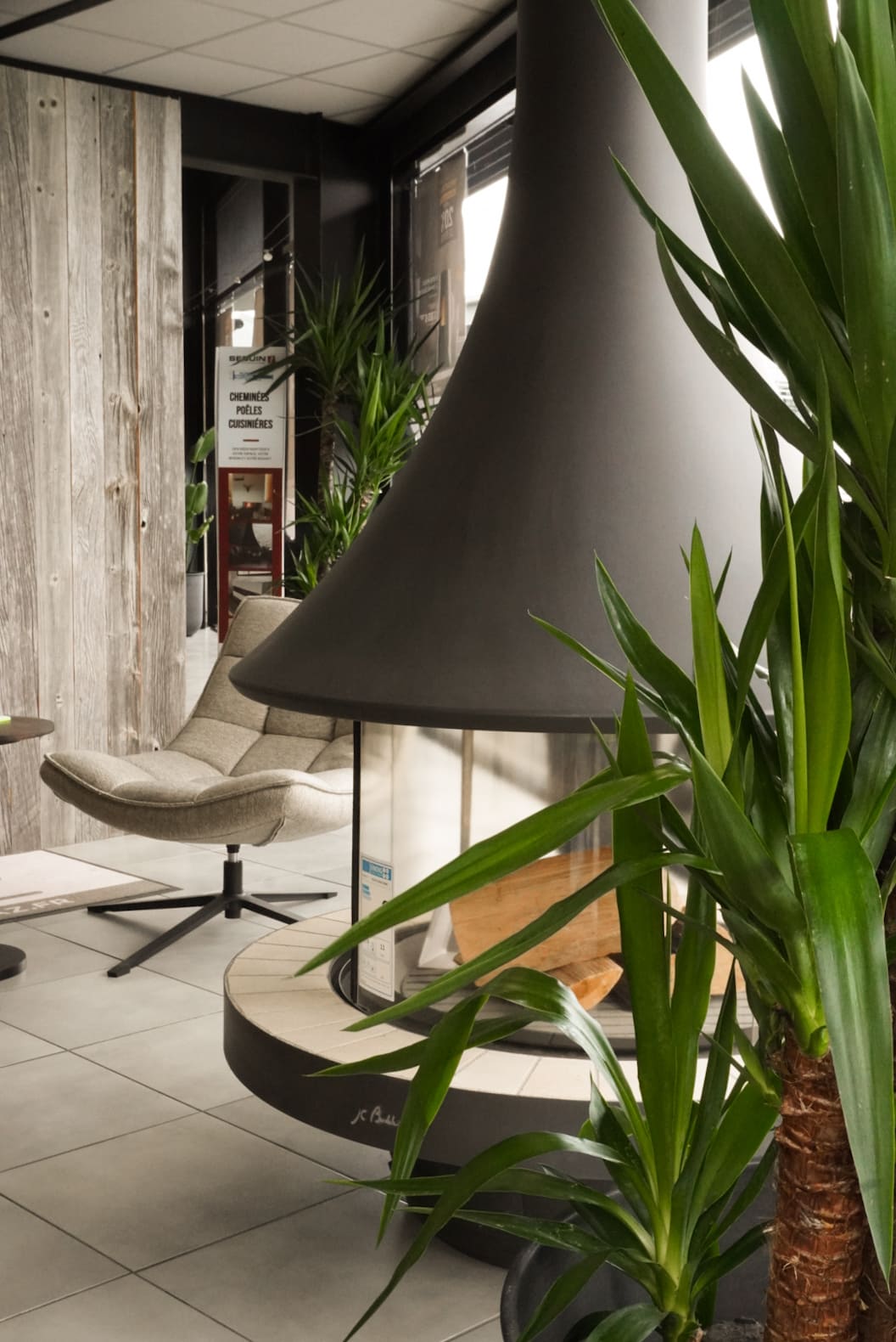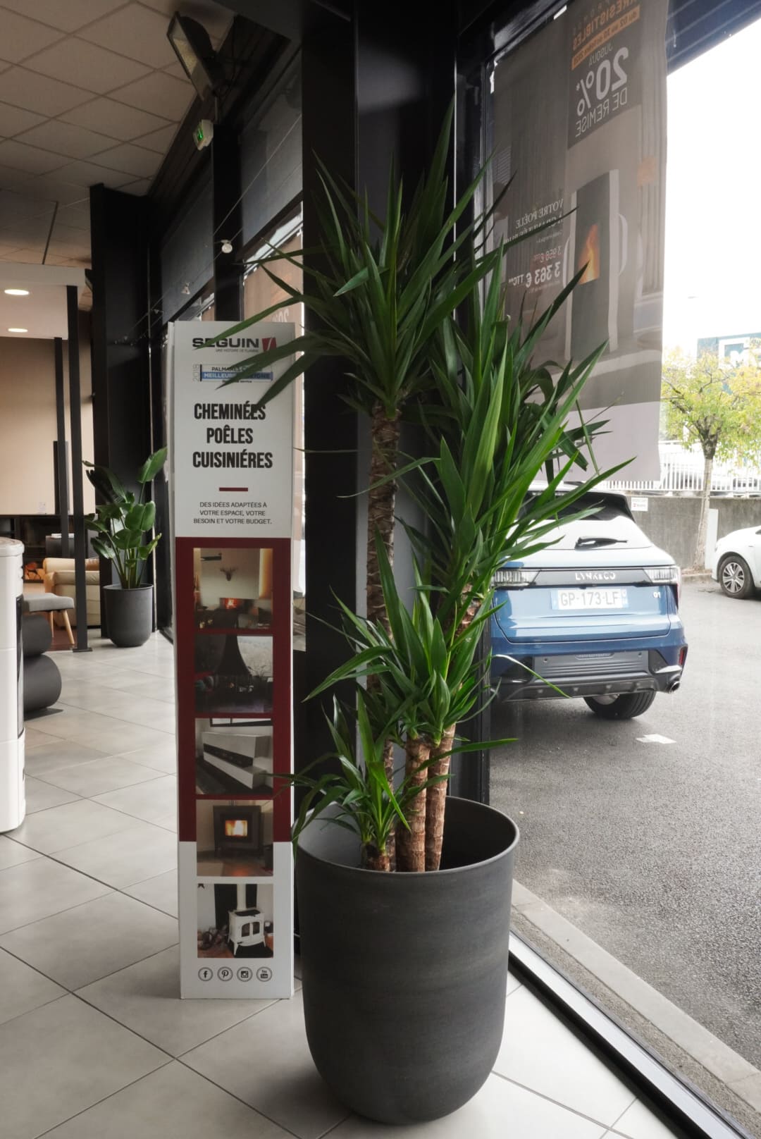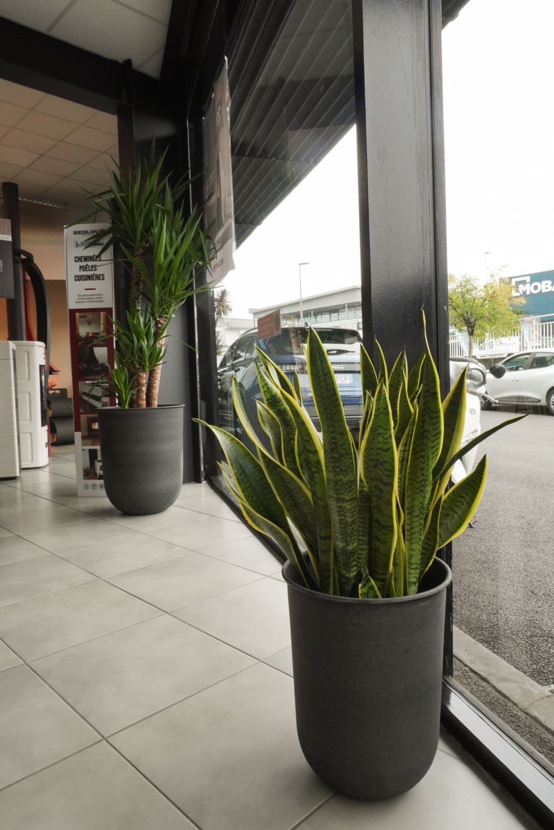 Un projet marquant pour Leaf, autour d’un véritable défi : faire cohabiter le feu, la chaleur… et le végétal. L’Atelier du Feu, showroom de poêles à bois et cheminées, présentait une ambiance très minérale, presque industrielle. Métal, lignes brutes, teintes froides… un univers cohérent avec le produit, mais qui pouvait sembler peu accueillant au premier regard. L’objectif était clair : rééquilibrer cette atmosphère en apportant de la chaleur visuelle, de la vie et créer un espace plus engageant, aussi bien de l’intérieur que depuis l’extérieur. Le végétal a été pensé comme un contraste subtil, capable d’adoucir les matières, de casser la rigidité des lignes et d’attirer naturellement le regard des passants. Depuis la rue, les compositions viennent capter l’attention et donner envie d’entrer. À l’intérieur, les plantes structurent l’espace, accompagnent le parcours client et créent une ambiance plus douce, plus vivante, sans dénaturer l’identité du lieu. Un projet autour d’un vrai défi : faire dialoguer le feu et le végétal, pour créer un équilibre juste entre caractère et accueil.